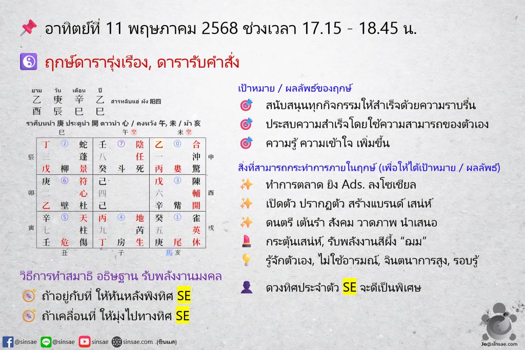 ℹ️ ใช้สำหรับพบปะ เจรจา ปิดดีล ทำสัญญา ทำสมาธิ หรืออธิษฐาน กระทำการให้สำเร็จภายในฤกษ์